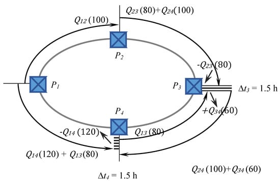 For the relation UDC4 to UDC1, the solution corresponds to variant 9 with minimum Ω’ (Table 1). In this way, the indexes for the flow have to be replaced: 1 with 4, 2 with 3, 3 with 2 and 4 with 1. It results Q43 + Q41, Q43, Q31, meaning Ω″ = Ω4 + Ω3 + Q41 Δt3 = 520.