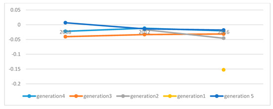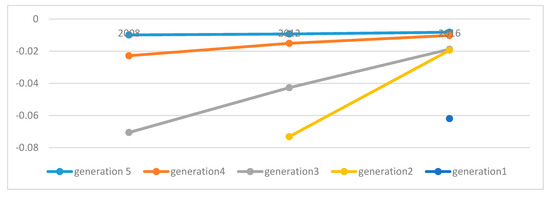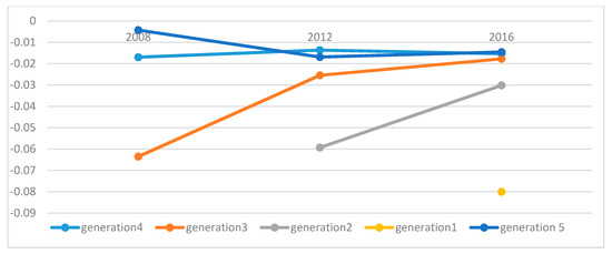 Table 3 shows the proportions of the unemployed and the average education by gender in each generation and cohort. It can be observed that women have a higher proportion of unemployment than men in all generations and years analyzed, so the goal of gender equity in the SDGs is not met. On the other hand, this employment gap is widened in the most current generations, that is to say, the youngest (generations 1 and 2), the gap in generations 3 and 4 is reduced, and it increases again in generations 5, 6, and 7; therefore, gender inequality in access to employment is broader in older and younger generations.