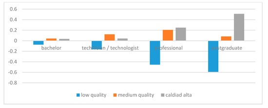 When analyzing the specific human capital, the age is observed, again taking as reference the people of 30–39 years. This effect is best seen in Figure 5, which shows that the younger generations are more likely to be in low-quality jobs and this trend decreases as it moves toward the older generations. In the case of education (Figure 6), people with a higher educational level are more likely to be in medium and high quality jobs.