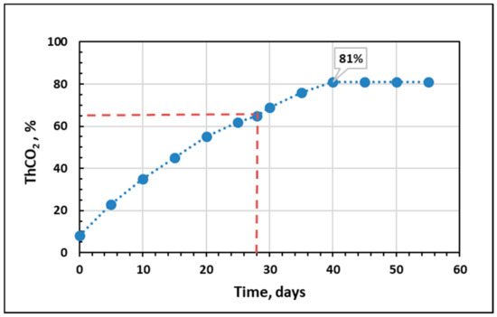 The properties of the new acid formulation were measured to optimize the treatment job in the field. GBRA had a viscosity of µ = 1.58 cP, density of ρ = 1.1 g/cm3, surface tension of σ = 31.4 mN/m, and a pH of 0.02. These properties were measured at room temperature and under atmospheric pressure. GBRA biodegradability was measured using the OECD 301B biodegradation test by the theoretical evaluation of carbon dioxide (ThCO2). The GBRA achieved a biodegradation rate of 65% by day 28, exceeding the requirements for ready biodegradability (60% by day 28) based on OECD test criteria [33]. Consequently, a plateau of 81% was achieved by day 40 (Figure 2). With growing environmental concerns, this biodegradation rate would make GBRA a good candidate to remove calcium carbonate-filter cake from oil and gas wells.