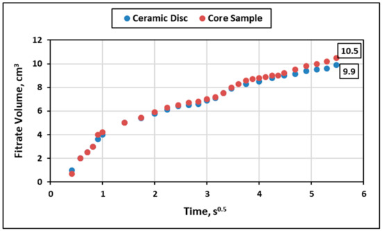 Filtration experiments were carried out to form the filter cake on the filtration medium and to perform the removal process. Figure 3 shows the filtration performance of the drilling fluid using a 25-micron ceramic filter disc and Indiana limestone core sample at 212 °F under 300 psi. With a ceramic disc, the drilling fluid yielded a total filtrate volume of 9.9 cm3 after the standard test time, i.e., 30 min. The filter cake weight and thickness were 5.57 g and 1.3 mm, respectively. The filtration performance on the core sample was similar to that on the ceramic disc, with a slightly higher fluid filtrate, i.e., 10.5 cm3. The removal process was performed on ceramic filter discs and real core samples under the same conditions. The filtration medium was soaked in 200 cm3 of 50 wt.% GBRA for 20 h. Figure 4 and Figure 5 show the ceramic disc and core sample before and after the filtration and removal tests. From the clean surface of the filtration mediums, GBRA was effective in removing the filter cake, as its calculated removal efficiency was greater than 95 wt.% in both cases.
