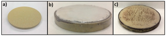 Ceramic filter disc: (a) before filtration, (b) after filtration, and (c) after removal with 50 wt.% green biodegradable removal acid (GBRA).