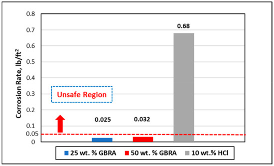 - GBRA (50 wt.%) yielded a corrosion rate of 0.032 lb/ft2 at 212 °F without adding any corrosion inhibitor that is below the standard corrosion rate approved by the oil and gas industry (<0.05 lb/ft2 at a temperature less than 250 °F), while the corrosion rate of HCl (10 wt.%) was 0.68 lb/ft2.