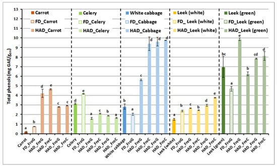 Total phenols content, expressed in mg of gallic acid equivalent (GAE) per gram of dry matter, in the raw bagasse (colored full bars) and vegetable waste powders. FD: freeze dried; HAD: air dried; Fro: frozen; Fre: fresh; G: ground; C: chopped. Mean values of three replicates. Bars indicate standard deviation. a,b,c,d,e Different superscript letters indicate statistical significant differences at the 95% confidence level (p-value < 0.05), for each vegetable waste.