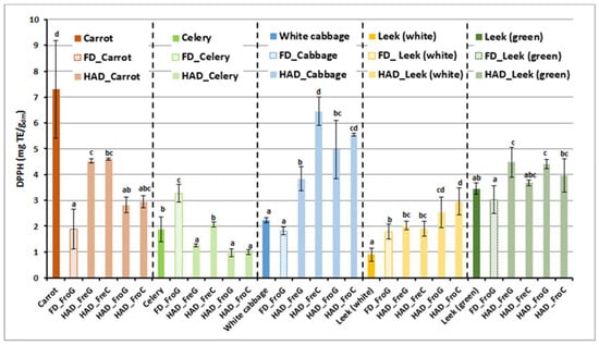 Results of antioxidant activity by the DPPH method, expressed in mg of trolox equivalent (TE) per gram of dry matter, of the raw bagasse (colored full bars) and vegetable waste powders. FD: freeze dried; HAD: air dried; Fro: frozen; Fre: fresh; G: ground; C: chopped. Mean values of three replicates. Bars indicate standard deviation. a,b,c,d different superscript letters indicate statistical significant differences at the 95% confidence level (p-value < 0.05), for each vegetable waste.