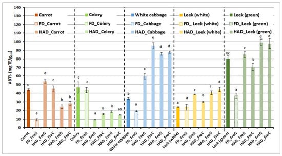 DPPH and ABTS antioxidant (AO) activities are summarized in Figure 3 and Figure 4. Again, AO properties of cabbage and green leek vegetable wastes and powders were significantly higher. In this case, also carrots, mainly non-processed, exhibited significant antioxidant properties. This difference with the previous analysis (phenols and flavonoids) was most probably due to carotenoids, one of the main bioactive compounds in carrots that exhibited significant AO activity, but are not detected by the previous methods [,]. The effect of processing variables depended again on the vegetable matrix being analyzed. In most cases, processing resulted in an increased AO capacity of samples. Storing in freezing conditions did not significantly affect leek and cabbage, although a negative effect was evidenced for carrot and celery. Except for celery, freeze-drying did not improve the AO capacity of powder, thus suggesting that, more than preserving the bioactive compounds present in the raw wastes, hot air drying would be inducing the formation of new antioxidant compounds. Grinding or chopping did not significantly affect the AO of powders in most cases. This implies that conditions of this stage will be selected as a function of drying behavior patterns, rather than functional properties of powders. Nevertheless, it must be taken into account that other important functional parameters such as fiber content may be affected by particle size [], for which this parameter needs to be known before making a decision. In addition, more detailed information on specific bioactive compounds potentially present in the vegetable wastes and their powders, such as carotenoids in carrots [], apigenin in celery [], glucosinolates in white cabbage, [] or sulfoxides in leek [], would be convenient to know, to discriminate more precisely which components are negatively affected by processing and which others enhanced. For this purpose, High-Performance Laser Chromatography (HPLC) analyses are planned to be performed in the following months.