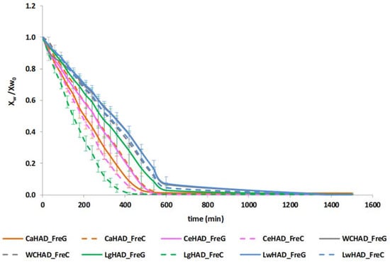 Kinetics of drying during the hot air-drying process are important as it is relevant to elucidate the duration of the constant drying rate period (CDRP), during which resistance for water transfer in the product is low as compared to evaporating rate and adiabatic conditions of drying prevail. It also allows estimation of the critical moisture content at which drying rate starts to decrease, indicating the beginning of the falling drying rate period (FDRP), when there is an internal control of mass (water) transfer. For this purpose, drying and drying rate curves of all the vegetable matrices were obtained during air drying at 70 °C. The analytical procedure consisted of placing each residue in two different trays for gravimetric determinations, and a third one for aw measurements. Samples were weighed along the whole drying process (i.e., until reaching a water activity value below 0.3), at increasing time intervals, starting from 30 min. When drying finished, final moisture content of samples (xwf) was determined by the following the official method established by the AOAC 934.06 [], and the moisture content along the treatment was calculated (xwf) by stating a dry matter balance (Equation (1)) along the drying process. Water mass fractions (xw) were then transformed into wet basis (Xw) to plot both the drying curve (Xw/X0 vs. time) and the drying rate curve (−ΔXw/X0)/Δt) vs. Xw/X0. Drying curves were obtained for the chopped and ground residues directly processed after reception (fresh) at the IUIAD pilot plant.