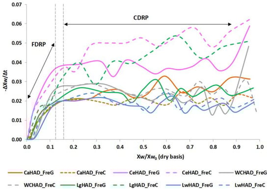 Drying rate curves (moisture content in gw/gdm) of chopped (C) and ground (G) vegetable wastes. Ca: carrot; Ce: celery; WC: white cabbage; Lg: leek green; Lw: leek white. CDRP: constant drying rate period; FDRP: falling drying rate period.