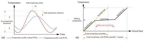 PCMs are the types of TES materials in which the latent heat is absorbed or released during the material’s phase change. They can help in regulating the ambient temperature within a specific range close to their transition temperature. When the ambient temperature increases more than the PCMs’ melting temperature, the chemical bonds in the material break up causing the material to absorbing the additional heat, while its state changes from solid to liquid. On the other hand, once the temperature drops below the PCMs’ freezing temperature, the material discharges the energy and, therefore, changes back to the solid-state [16]. If the material’s phase transition temperatures (i.e., the melting and freezing temperatures) match with the required comfort temperature in buildings, it can help to maintain the indoor thermal environment within comfortable conditions and reduces the total hours of thermal discomfort by absorbing the extra heat [4] and, thus, reducing the heating and/or cooling loads. Figure 1a illustrates how PCMs can improve a building’s indoor environment by reducing indoor temperature peaks and fluctuation. Furthermore, the favourability of using PCMs lies in the ability of a thin layer of PCMs to store a large amount of heat. For instance, a wall made from PCMs could be 20 times thinner than a wall made from concrete [31]. The point when the material changes its phase greatly enhances the material’s storage capacity [30], which can store a higher density of thermal energy with a smaller change in temperature [7,29], as shown in Figure 1b.