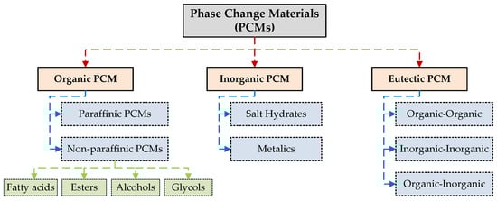 Generally, phase-changing in materials has four types: solid–solid, solid–liquid, solid–gas and liquid–gas [4]. However, the solid–liquid variety can be practically applied in the building sector for many reasons, including its lesser volume alteration, requiring a smaller quantity of the material to store a given amount of energy, and the nearly constant temperature by which the thermal energy is stored [4,11,33]. PCMs come in various types. Generally, they are classified into three main categories: organic PCMs, inorganic PCMs, and eutectic PCMs. Each category can be divided based on the various components of the PCMs [4,11,16,34,35], as shown in Figure 2.