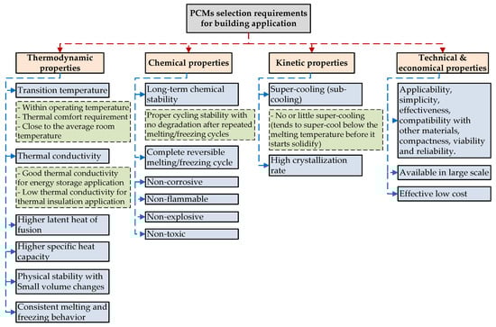The selection of an ideal phase change material (PCM) for the building application is important and governed by a wide range of characteristics and requirements that should be fulfilled, including thermodynamic, chemical, kinetic, and technical and economic characteristics [4,11,12,15,36]. These characteristics and requirements are summarized in Figure 3.