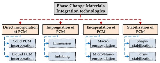 Different technologies are available for PCMs’ integration into building materials. These technologies can be classified into direct incorporation, immersion, encapsulation, and stabilization [25] (Figure 4). With direct incorporation, the PCMs are added directly into the materials, while, in immersion, the building materials and elements are immersed into the liquid PCMs allowing for absorption by capillary action. Even though both technologies are economical and practical, the leakage of PCMs, inflammability, and incompatibility with building materials are the main drawbacks of these techniques. On the other hand, the PCMs’ encapsulation involves macro-encapsulation, micro-encapsulation, and nano-encapsulation. In the macro-encapsulation, PCMs are packed in different types of containers (tubes, spheres, panels, etc.), while, in the micro-encapsulation and nano-encapsulation, the PCMs particles are enclosed in a thin shell (i.e., between 1000 and 1 µm for micro-capsules and below 1000 nm for nano-capsules) [25,38]. Finally, PCMs stabilization means that they are incorporated into a supporting porous structure such as high-density polyethylene [34].