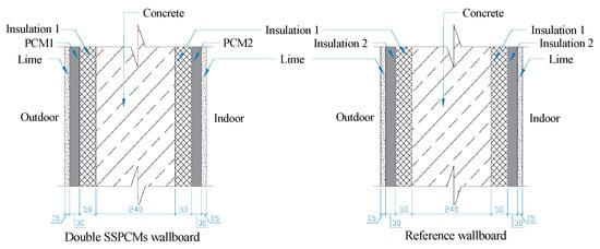 Wall with PCM layers (left) and the reference wall without PCMs (right) [48].