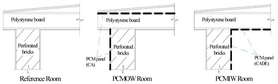 Kong et al. [18] applied two types of macro-encapsulated PCMs on the wall’s external and internal surfaces. Capric acid (CA), with a melting point of 30.2 °C, was applied on the external surface of the wall, while a mixture of capric acid and 1-dodecanol (CADE), with a melting point of 26.5 °C, was applied on the internal surface of the wall. The mixture was prepared to tackle the super-cooling effect, allowing the PCM to freeze within a small range of temperature fluctuation in the internal environment. A 240 mm thick wall, made of perforated bricks, was used to construct the walls of three rooms with the dimensions of 2000 × 2000 × 2400 mm, while the roof was constructed from an insulation sandwich board (Figure 6). One room was used as a reference without PCMs, while the other two rooms were used to install the PCM panels on the external surfaces of one room (PCMOW) and in the internal surfaces of the other room (PCMIW).