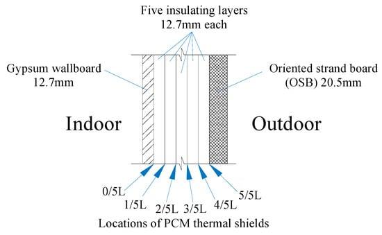 Jin, Medina, and Zhang [27] experimentally evaluated the thermal performance of different positions of the PCM layer in the walls to find the optimum position. A PCM thermal shield (PCMTS), with a melting temperature range of 24–34 °C, was used in this work and the experiments were performed using a dynamic wall simulator. The wall cavity was made of five insulating layers (i.e., 12.7 mm foam insulation sheet) sandwiched by a 12.7 mm gypsum wallboard for the internal surface, and 20.5 mm oriented strand board (OSB) for the external surface. The total layers of the wall without the PCMTS layer were seven layers, which allowed for six different positions of PCMTS layers to be tested. By taking the thickness of the insulation cavity as L, the tested positions from indoor to outdoor were referred to as 0/5L to 5/5L, as can be seen in Figure 7. In addition, one wall without PCMTS was used for control. The simulator was in an air-conditioned laboratory, with a set point of 22–24 °C which represents the indoor environment, while inside the simulator was the heat source to reflect the outdoor conditions. The heat sources in the simulator were set to produce the heat on the wall surface similar to an actual west wall and were turned ‘on’ for 11 h then turned ‘off’ for 13 h to complete one cycle of 24 h, which was repeated several times.