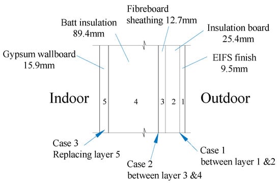 Zwanzig, Lian, and Brehob, [23] numerically investigated a PCMs composite wallboard incorporated into different positions in a multi-layered building wall under all seasonal conditions. The multi-layered wall consisted of: (1) 9.5 mm EIFS finish (exterior), (2) 25.4 mm insulation board, (3) 12.7 mm fibreboard sheathing, (4) 89.4 mm batt insulation and (5) 15.9 mm gypsum board (interior). They used a PCM composite wallboard containing paraffin PCM with a transition temperature range of 25–27.5 °C. Three different positions for a PCM layer were considered for evaluation: Case 1, between layers 1 and 2; Case 2, between layers 3 and 4; and case 3, replacing layer 5 (Figure 8). The indoor air temperature was selected to be 20 °C for the heating season and 24 °C for the cooling season. The results showed that Case 2 achieved the best results in peak load shifting and reductions compared to other cases during both heating and cooling seasons.