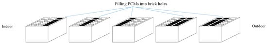 Hichem et al. [24] numerically investigated the effects of filling bricks’ holes with macro-encapsulated PCMs on improving the thermal inertia of the wall. The numerical results were validated with an experimental model. After that, the effects of the PCMs type, position and amount were investigated. PCMs (i.e., five types with melting temperatures of 29.9–52 °C) were filled in the holes of the bricks in one of three positions: external, middle or internal holes (Figure 9). The results showed that the middle position achieved the highest reduction in the total heat flux (i.e., 82.1%) compared to the brick without PCMs. In addition, they increased the amount of PCMs in the bricks by filling another row of holes, which can be either the internal or external holes. The results showed that the bricks with PCMs in the middle and external holes achieved the highest reduction in the total heat flux, though the increase was only 7.92% with double the PCM quantity.
