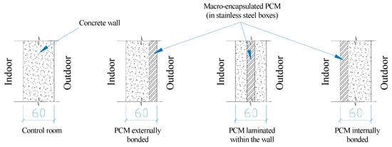 Shi et al. [25] experimentally investigated the effects of applying macro-encapsulated PCM in different positions within concrete walls on the indoor temperature and humidity. The PCM (i.e., paraffin with a melting temperature of 20.78 °C) was macro-encapsulated in a stainless-steel box in order to increase thermal conductivity, and was tested in three positions; (1) externally bonded, (2) laminated within the wall or (3) internally bonded (Figure 10). Three model rooms with the dimensions of 545 × 545 × 560 mm were used to test the different positions of PCM layer, while one other room, with concrete walls without PCMs, was used as a control. The total thickness of all walls in all room models was controlled to 60 mm, including all layers.