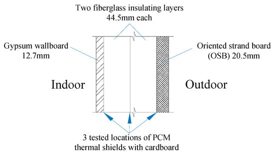 In another work, Jin, Medina, and Zhang [19] experimentally investigated the thermal performance of three different positions of PCMTS using the dynamic wall simulator. A typical North American residential wall system was selected for the test, which consists of (1) 12.7 mm gypsum wallboard, (2) cardboard, (3) PCMTS (4) two layers of 44.5 mm fiberglass insulation and (5) a 20.5 mm oriented strand board (OSB). A PCMTS layer with cardboard was placed near to the gypsum wallboard, near to the OSB and between the two insulation layers (Figure 11). The experimental setup was similar to the previous work [27]. The results showed that the higher reduction in the peak heat fluxes was 11%, with the PCMTS layer near to the gypsum wallboard within the cavity. However, the reduction in the peak heat fluxes was smaller when the PCMTS layer was placed between the two insulation layers, while there was no effect with the PCMTS layer placed within the cavity near to OSB. They concluded that PCMTS should be placed closer to the conditioned space.
