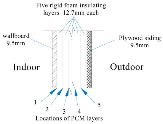 Lee et al. [26] investigated the thermal performance of building walls integrated with a thin PCMTS layer in a different position. The experiment was conducted using two 1830 × 1830 × 1220 mm identical test houses. The walls consisted of 9.5 mm plywood siding, five layers of 12.7 mm rigid foam insulation and 9.5 mm wallboards. In one test house, the PCM layer was installed in the cavity of the south and the west walls, each in one position for a total of five different positions, starting next to the wallboard (first position) and proceeding between the foam insulation layers towards the exterior side of the wall (Figure 12). The second test house was used as the control. The indoor environments of both test houses were air-conditioned.