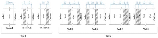 PCM layers’ position within the wall; First test (left) and second test (right) [22].