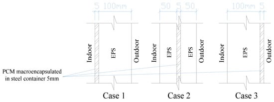 L. Zhu et al. [20] numerically investigated the influence of the position, thickness, and orientation of the PCMs layer on the indoor thermal discomfort during summer in north China. A model room, i.e., 2400 × 2400 × 2400 mm, was used and made of 100 mm thick modular prefabricated EPS panels, covered by two 0.5 mm thick colour steel sheets on each side. An organic PCM (i.e., RT26) was placed in a 2200 × 2200 mm steel container with various thicknesses inside the EPS panel. The optimum position of PCM layer, with a thickness of 5 mm, was investigated in the walls, roof, and floor in three positions; in the internal surface (Case 1), in the middle (Case 2), and in the external surface (Case 3), as shown in Figure 15. The simulation was conducted for five days (i.e., 6–10 July), using the meteorological weather data of Tianjin, and the last day was used for analysis. The simulation was validated experimentally in the outdoor environment using a modular prefabricated EPS panel with a PCM layer (i.e., RT 42 with a melting point of 42 °C) placed on the exterior surface, and the results showed good agreement. The effect of the PCM layer was numerically investigated in the six orientations.