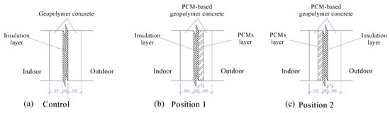 (a) Geopolymer concrete wall (control), (b,c) PCM layer positions [50].
