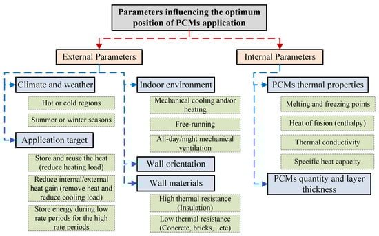 Even though different optimum positions were obtained in the conducted studies, performing a complete daily melting/freezing cycle was a key element to achieve the best thermal performance and the optimum position of the PCMs’ application. Therefore, the optimum position of the PCMs’ application in the wall is the position that provides adequate heating for the PCMs to fully melt during the day-time, then adequate cooling in order for them to fully freeze during the night-time. Many parameters might influence this process and, therefore, can be categorized into two groups: external parameters and internal parameters, (Figure 18). The external parameters include climate and weather conditions (i.e., hot or cold regions and summer or winter times), application target (i.e., reduction in indoor temperature fluctuation, storing and reuse of heat, reduction in internal heat gain, or reduction in external heat gain), indoor environment (i.e., mechanical cooling and/or heating, free-running or all-day/night mechanical ventilation), and the wall’s orientation and materials. In contrast, the internal parameters include the PCMs thermal properties (i.e., melting and freezing points, enthalpy or heat of fusion, thermal conductivity, and specific heat capacity), and the PCM quantity and layer’s thickness.