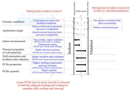 - Application target: reducing the external heat gain requires the PCMs to be applied towards the external surface of the wall, while reducing the internal heat gain and indoor temperature fluctuation requires the PCMs to be applied towards the internal surface of the wall;