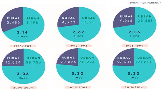 As shown in Figure 1, since the implementation of the Hukou system, which restricted freedom of migration, the income gap between urban and rural areas had always remained 3-fold. However, in terms of inflation accounting for monetary value, the actual income gap increased from 2700 Yuan per capita from 1985 to 1989, to 82,000 Yuan from 2010 to 2014 by approximately 30-fold, resulting in a difference of 80,000 Yuan. []