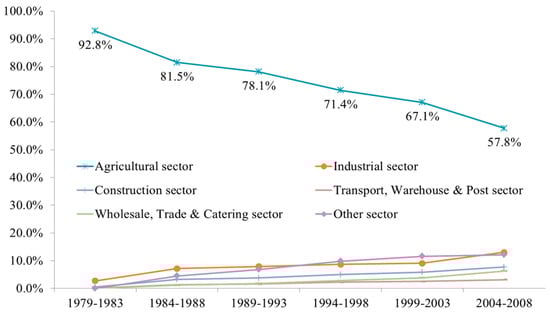 Changes in rural areas happened not only in the income but also in the overall industrial structures. Figure 2 shows that the proportion of the labor force in the agricultural sector (Agriculture, Forestry, Livestock, Fishery) decreased from 92.8% in 1979 to 57.8% in 2008. During the same period new employment was created in wholesale, trade and catering sectors (from 0.0% to 6.2%) and the other sectors (from 0.0% to 12.1%). Employment in the construction sector (from 0.5% to 7.7%) and transport, warehouse and post sector (from 0.2% to 3.2%) increased by about 16 times, and in the industrial (mining and manufacturing) sector (from 2.7% to 13.0%) by about four times. As excess labor force from the agricultural sector found employment in other sectors within the same region or moved to urban regions for higher pay, migration between urban and rural regions became popular and diverse job selection options became available for the labor force previously engaged in the agricultural sector [].