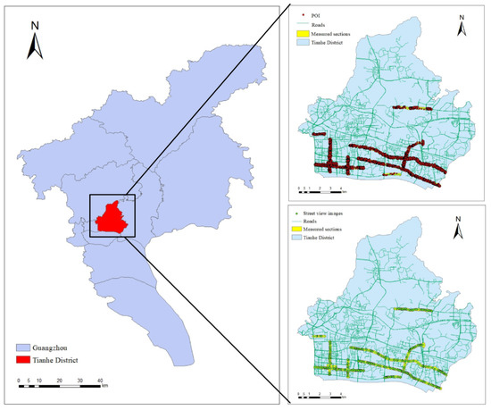 Taking Tianhe District in Guangzhou, Guangdong Province, as the study area, experiments are applied to validate the proposed approach. As shown in Figure 1, Tianhe District is the central area of Guangzhou. The traffic resources in the area are concentrated, and there are multilevel urban traffic systems such as subways, bus rapid transit (BRT) and railway stations. However, the unbalanced development of roads still exists in this area.