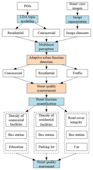 Faced with these challenges, we propose an adaptive street quality assessment approach from the perspective of urban function. To identify different urban functions that streets serve, we utilize street view images and POIs for automatic detection including commercial, residential and traffic functions. Despite the fact that traffic function cannot be considered as traditional ones such as residential and public services, it serves as the basic element in the road networks, and thus should be involved in street-level urban functions. To fit the adaptiveness of various urban functions, we assess street quality using the urban function weight and urban function indicators based on POIs and street view. On this basis, a field survey is considered to validate the proposed assessment method. The contributions of this research are listed as follows: