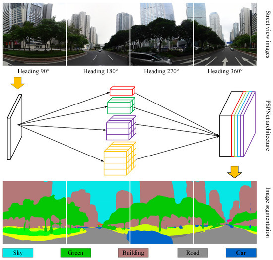 As shown in Figure 3, our extraction unit is a location point. Images from four headings are collected in each location, including 90°, 180°, 270°, and 360°. Then, different objects in the street view images are detected automatically, including greenery, sky, roads, buildings, and cars, by applying the PSPNet architecture [31]. PSPNet can reach an accuracy of 79.70% for classifying 150 categories after being trained by the ADE20K dataset [32].