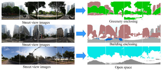 On this basis, greenery, sky, roads, buildings, and cars objects are detected from each segmented street view image. Then, building enclosure degree, greenery enclosure degree, and open spaces are calculated by pixels,