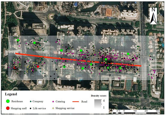 As shown in Figure 6, the distribution of POIs shows a trend of clustering and commercial-related POIs, and residential-related POIs are found near both shopping malls and residential areas. However, the types of POI distribution are not obvious. For example, catering is distributed around residential areas and in business office buildings and large shopping malls. Therefore, to solve the above problems, we chose grids with residential areas and shopping malls to calculate the average value of the kernel density of facilities in the selected grid. We calculated the kernel density of 21 road sections, and we selected 33 grids in all, including 11 for shopping malls and 22 for residential areas. The lowest nuclear density is 221, and the highest is 65,259. The lowest kernel density is 221, and the highest is 65,259. The traffic function is the basic function provided by roads, and the residential and commercial urban functions rely on the traffic function. Therefore, we calculated the bus stop service length of the 21 selected road sections. A detailed discussion is provided in Section 5.