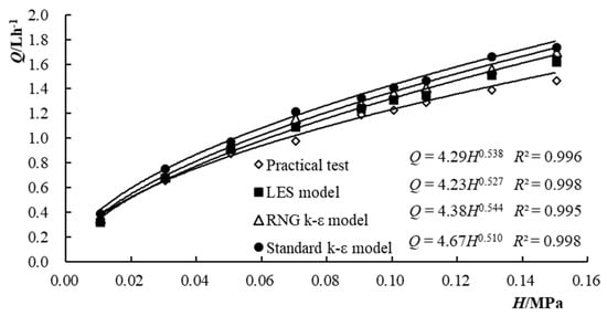The hydraulic performance curve of the emitter was obtained by the experiment according to the requirements of “technical specification and test method of agricultural irrigation equipment emitter (GB/T17187–1997)” [26]. The flow state index and flow coefficient were calculated by the least square method based on changing the flow–pressure relation formula into a linear relation curve by logarithm, and it was used as a regression equation [27].