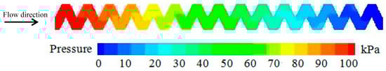 At 0.1 MPa, the pressure distributions of the water flow along the flow direction at the longitudinal sections with the depth of 0.01 mm away from the cross-section of z = 0.5D of the emitter flow path are shown in Figure 6. The pressure showed a step-like uniform decrease along the flow direction, and the pressure sharply dropped at the sudden change of the flow path structure.