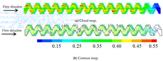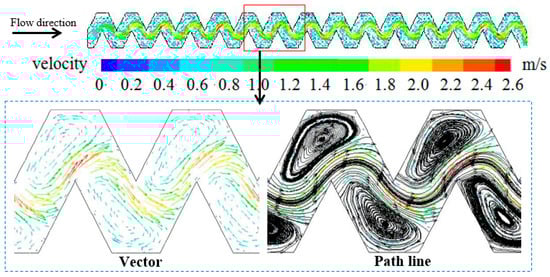 At 0.1 MPa, the streamline distribution of velocity vector in the flow path of the emitter is shown in Figure 7. The fluid movement in the flow path was clearly divided into a high-speed mainstream region and a low-speed non-mainstream region. The velocity ranges in two regions were 1.5–2.6 and 0–1.6 m/s, respectively. In the near-wall surface area of the flow path, the velocity was smaller and accompanied by the generation of vortices. The velocity distribution among different structural units was relatively consistent, showing a state of periodic change.