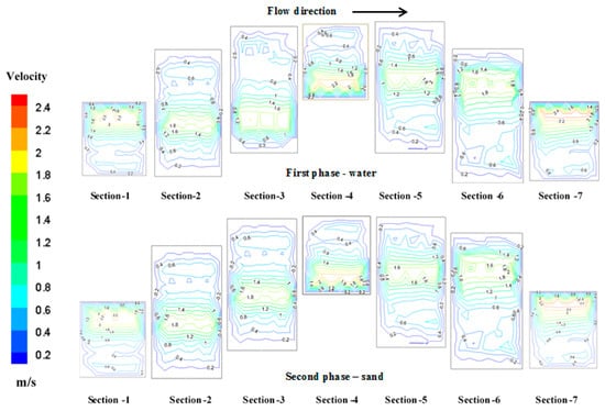 The contour maps of velocity distribution of water and particulate matter at the different cross-sections of the flow path.