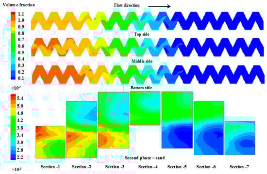 The particle volume distributions along the flow path depth direction and different cross-sections are shown in Figure 11. Under certain hydraulic condition and particulate matter conditions, the amount of particulate matter that the water stream can carry was limited. With the increase of the depth of the flow path, the volume fraction of the particle phase at the same position of the flow path showed an increasing trend, indicating that during the forward movement of the water flow, the particles were continuously deposited under the action of gravity. Sediment was mainly deposited in the first half of the flow path.