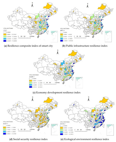 Third, values of the social security resilience index were low, and the distribution of those cities was relative concentrated. As seen in Figure 1d, the number of smart cities located in the highest-value section of social security resilience index was small and discretely distributed in the eastern region; the number of smart cities in the sub-high-value section was also small and concentrated in the east and scattered in the northeast area; smart cities with medium value were distributed in the central and eastern regions; smart cities in the lowest-value section were large and distributed in western, central, and northeast China.