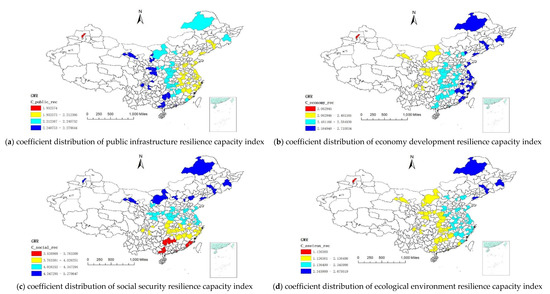 Third, different influencing factors have significant positive influences on resilience capacity of smart cities, and the spatial distribution of influence coefficients is quite different [36]. Coefficients of public infrastructure resilience capacity index are significantly positive and show a decreasing spatial distribution pattern from west to east, indicating that the positive influence of public infrastructure resilience capacity of smart cities in western China on urban resilience is higher than that in other areas [37]. Coefficients of economic development resilience capacity index of smart cities are significantly positive and show a decreasing spatial distribution pattern from east to west, which indicates that the positive influence of economic development resilience capacity of smart cities on urban resilience in the eastern region is higher than that in other areas. Coefficients of social security resilience capacity index of smart cities are significantly positive and show a decreasing spatial distribution pattern from north to south, which indicates that the positive influence of social security resilience capacity of smart cities on urban resilience in northern China is higher than that in other areas. Coefficients of the ecological environment resilience capacity index of the smart city are significantly positive and show spatial distribution patterns of decreasing from east to west in turn and concentration, indicating that the positive influence of ecological environment resilience capacity on urban restoration capacity of the smart city in the eastern region is higher than that in other areas [38].