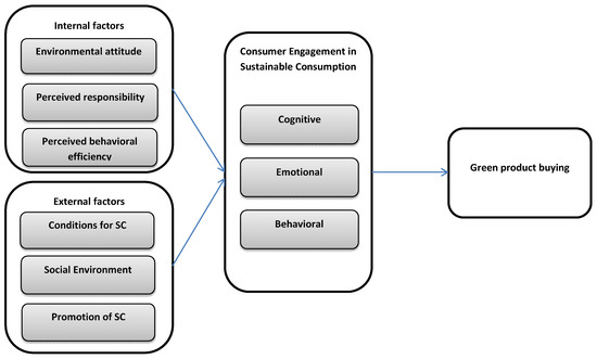 The model reads as follows: Internal and external factors influence consumer engagement in sustainable consumption, which in turn has a positive impact on consumer behavior (green product buying).