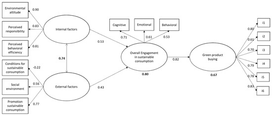 Since the construct of consumer engagement is often considered to be a mediator that facilitates some expected outcomes (e.g., loyalty, value for company, value for customer, sustainable behavior), we derived two mediation hypotheses H4 and H5. In line with James et al. [66], we tested for complete and partial mediation. The effects of internal factors and external factors on green product buying behavior appeared to be completely mediated by consumer engagement in sustainable consumption (standardized indirect effects: 0.43 and 0.35, respectively, ps < 0.01), supporting hypotheses H4 and H5. Altogether, 67% of the variance in green product buying behavior was explained by the indirect effects of the two groups of factors and the direct effect of engagement. We tested an alternative model in which internal factors, external factors and consumer engagement in sustainable consumption were all independent variables. This model showed that the direct effects of internal factors and external factors were not statistically significant. So, there are no direct effects of the two former factors, but the mechanism goes indirectly via overall engagement in SC, evidencing its pivotal position.