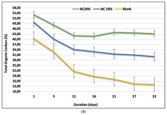 In general, all composting feedstocks might comprise all the nutritional elements required by the soil, but in a certain range. Consequently, several components, particularly TOC and TN, should be monitored during the biological process. The tendencies of TOC and TN variations were observed in Figure 4. During the composting experiment, Figure 4a shows a sharp decrease of total organic carbon contents, however, the notable decline of TOC content was registered in the case of biologically-treated wastes without biochar (BC0) started at 40% to finalize at 14%. Such a TOC profile can be explained by an instable fraction of OM which was mineralized, and it can also be directly related to the rate of microbial actions, because microorganisms consume these organic elements during the process [42]. However, regarding the bioreactors which included biochar, the TOC contents determined initially were 54% and 49%, which reduced to 43% and 30% for BC20 and BC10, respectively. As the biochar used during the experiments was produced from natural beechwood, it can be considered as a supplementary source of carbon for the amended mixtures, which highlighted the different TOC contents in each combination [41]. Thus, biochar is known to have a recalcitrant structure which is strongly reduced during the process, but leads to a slightly higher amount of carbon content at the end of the process, especially for the mixture with 20% of biochar added [43]. Comparable results showed that the TOC content decreased to 29% and 30% in piles treating food waste containing 10% and 15% of biochar, which are very close of the values of the BC10 trial tested in this work [19].
