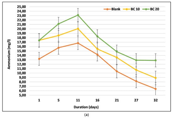 As the elevated temperature environment of the compost during the first few days powerfully frustrated the activity of nitrifying bacteria, the NO3− concentration decreased notably from around 2.74 to 1.24 mg/L before a remarkable rise was detected, increasing to 2.90 mg of NO3−/L at the end of the process (Figure 5b). However, for amended reactors, regarding the NO3− concentration, a significant rise was recorded for the amended mixtures with 20% of biochar, particularly during the curing phase. The temperature peaks were followed by sharp declines, which were noted (from the 5th to the 11th day) and attained 1.64 and 2.09 mg/L for BC20 and BC10, respectively, which were higher as compared to the nitrate concentration in BC0. Consequently, biochar exhibited an adsorption capacity with regard to organic nitrogen, and enhanced the nitrification mechanism, notably during the maturation phase. This could be due to an advantageous microenvironment for the nitrifying bacteria, that converts ammonia into nitrate [24]. Comparable NH4+ and NO3− aspects were found by several researchers focusing on poultry litter and biochar co-composting, who affirmed that the NH4 -N level was balanced at the end of the biological process, and that compost without any amendments was characterized by a lower NH4+ content than the amended composts [48].