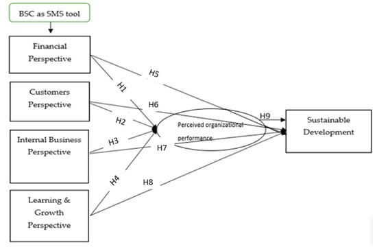 A greater number of organizations than ever before have started focusing on the idea of sustainability as their natural process of the strategy being executed in order to make sustainability a routine matter of the organization [78]. Resultant social and environmental domains of sustainability also attracted the attention of researchers alongside the economic domain. Nevertheless, most of the studies investigated all domains of sustainability at once [79]. Hence, the studies investigated the relationship between the internal business perspective of BSC with the environmental aspect of sustainability and the learning and growth perspective of BSC with the social domain of sustainability [52,75,76,77,80]. Therefore, the above literature postulates the hypothesis for the study: