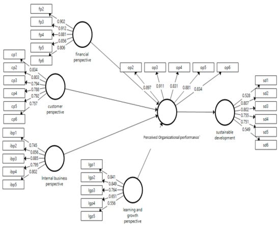 The factor loading Figure 3 depicts that in the financial perspective variable, item fp3 has the highest value of 0.912, and fp6 has the lowest value of 0.806. While, in the perceived customer perspective variable, cp1 has the highest value, 0.834, and cp6 has the lowest value in factor loading, 0.757. Additionally, the variable perceived internal business perspective has values between 0.885 and 0.745, for ibp3, and ibp1, respectively. Moreover, the perceived learning and growth perspective variable’s loading values range from 0.849 to 0.556 for lgp1 and lgp5, respectively. Furthermore, op3 and op4 have loading values of 0.911 to 0.831, respectively, for the perceived organizational performance variable. Lastly, the sustainable development variable’s loadings are between 0.807 and 0.528 for sd2 and sd3, respectively. This suggests that unrelated constructs are eliminated in order to make data more reliable. Hence, applicants can rely on the study results while they are making decisions.