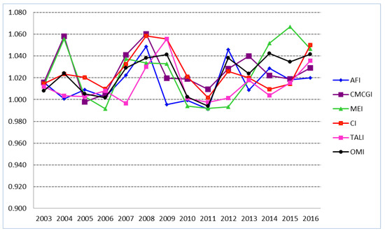 Construction materials, ceramic and glass industries (CMCGI); mechanical and electrical industries (MEI); and chemical industries (CHI) are the major performers with an annual TFP growth of 2.6% (mainly due to technical change growth of 3.2%, 3.9%, and 2.2%) followed by other manufacturing industries (OMI), agri-food industries (AFI), and textile, clothing, and leather industries (TCLI). Textile, clothing, and leather industries seem to be the weakest performer with only 1.3% growth in TFP followed by agri-food industries with 1.8% growth in TFP. A surprising result is that over the period 2002–2016, these results show that technical change is the principal source of TFP growth for all sectors as shown in
